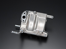 弊社の金型鋳造は、金型を鋳造機に設置し、湯口から重力によりアルミ溶湯を型内に流し込み凝固させる重力鋳造(グラビティ)です。アルミ溶湯を一旦金型手前の受皿に注いで、その後、金型をゆっくり傾動させながら製品部へ充填していく可傾式鋳造をおこなっています。可傾式鋳造により注湯速度を一定に保つことが出来、品質のバラつきが少なく量産に適しています。また、砂中子により、複雑な中空部品にも対応しております。